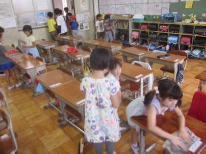 6年生のお兄さん・お姉さんと楽しく掃除をがんばっています。掃除の分担は一週間ごとに変えています。「どこをがんばっているの?」とまた聞いてあげてください。