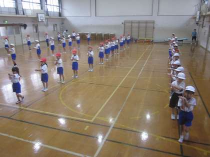 今日は体育館で最後の練習を行いました。一人一人の子どもたちが一生懸命に取り組むことができました。1・2年生が共にがんばったこれまで約1か月間の練習,協力し合って仲良くなって,ダンスが上手になって…とっても楽しかったです。