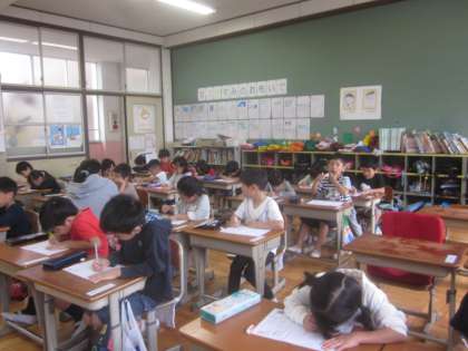 願いかなわず雨でした。楽しみにしていた運動会は,来週11日(水)になりました。楽しみが伸びたと考えて…気持ちを切り替えて,今日の学習もしっかりとがんばっていた1年生です。3組との合同学習やカタカナの学習,クラスみんなでドッジボール,算数プリントにお話の絵作りなどなど。子どもたちとってもえらいなぁと感じる一日でした。