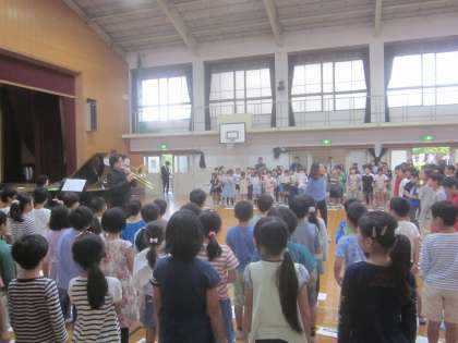 大阪交響楽団の方に来ていただき,ワークショップを開いていただきました。いろんな楽器の音色を聴いてうっとりしていた1年生の子どもたちです。今度の演奏会がもっと楽しみになりました。