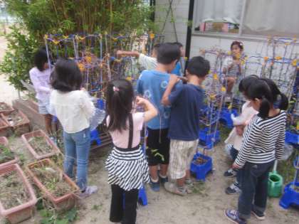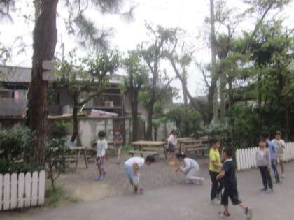 生き物さがしを今日も楽しみました。バッタの数はやっぱり少なくなってきています。代わりにコオロギの虫の音がたくさん聞こえていました。新しくドングリや松ぼっくり,柿も見つけることができました。もうすぐ秋ですね。