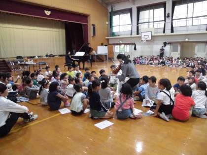 大阪交響楽団の方に来ていただき,ワークショップをしていただきました。バイオリンやフルート,トロンボーンの演奏を間近で聴かせていただき,楽器のことをたくさん教えていただきました。中でも,ペットボトルに息を吹き込むと音が鳴ることを教えていただいたので,生活科「あそんでためしてくふうして」で早速試している様子が見られました。ほかにも楽器になりそうなものを見つけたようです。30日の演奏会も,これからの生活科の学習も楽しみです。