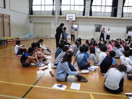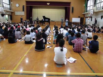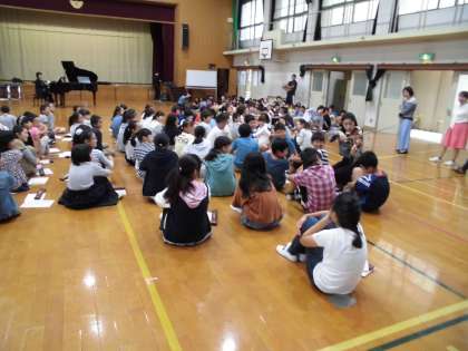 本日1・2時間目に,大阪交響楽団の方によるオーケストラ公演ワークショップがあり,全校児童が体育館に集合しました。10月30日(月)午後の朱六校での演奏会に向け,楽器を教えていただいたりみんなで「ビリーブ」を歌ったりしました。どの学年の子どもたちも集中して取り組んでいました。5・6年生も高学年らしい姿勢や態度で,楽しく意欲的にワークショップに参加することができていました。