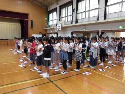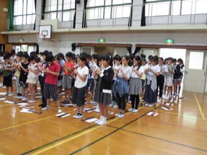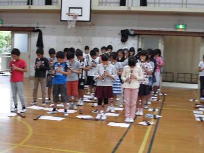 全校でのワークショップの後,4・5・6年生は「ビリーブ」のリコーダー演奏をしました。3学年で合わせたのは初めてでしたが,どの学年もそれぞれに一生懸命練習を積んできたようで,リコーダーとピアノ・トロンボーンのきれいな音色が体育館に響いていました。演奏会当日が楽しみです。