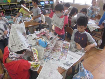 新聞紙を使って変身しました!!服やかばん,靴に帽子,中には防具?武器!?イヤリング!?子どもたちは新聞紙からいろんなものを作り上げていました。発想がとっても面白かったです。