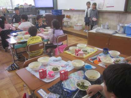 子どもたちの楽しみにしている給食時間,おいしく食べて仲良く話して,とっても楽しそうです。早く食べ終わった子たちは,しりとりも楽しんでいました。