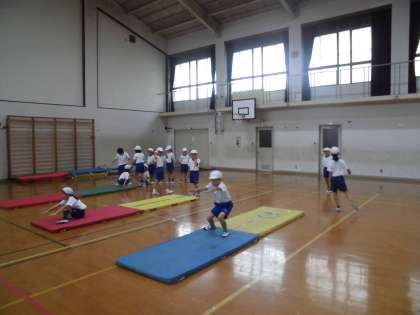 体育の学習では,マットあそびが始まりました。前転,後転,側転などに取り組んでいます。準備もみんなで力を合わせてがんばっています。