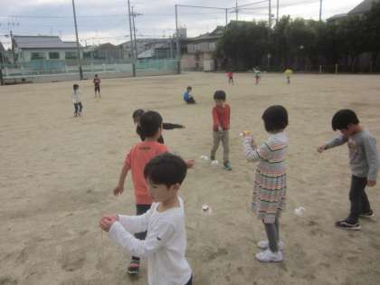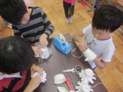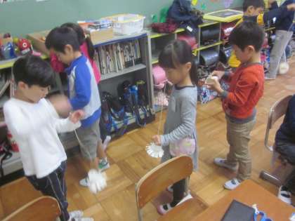 クルクル回る紙コップ,羽根の角度を工夫したり,羽の色をきれいに塗ったり…みんなで工夫を考えながら楽しみました。運動場を走り回るのも楽しかったです。