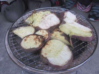 みんなで収穫をしたサツマイモ,七輪で焼いておいしくいただきました。あいにくの雨でしたが,体育館の軒下で,グループごとにみんなでわいわい楽しく食べました。あんまり食べ過ぎると給食が食べられないので,気にもしながら…「もっともっと食べたいよ〜!」そんな気持ちいっぱいのお芋パーティでした。