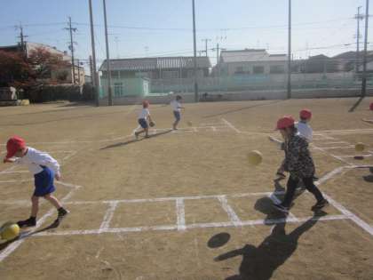 とっても気持ちのいい日差しの下,みんなで楽しみました。ドリブルやキャッチも楽しそうです。「どうやったら遠くに,強く投げられるんだろう?」と考え,しっかりと練習をしている子も多かったです。