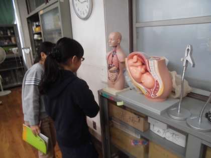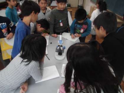 いよいよ理科室を使っての学習が始まります。今日は,理科室での服装やルールを確認した後,どのような器具や道具があるかを調べました。また,どんなことができるかについても話し合いました。食塩の結晶を顕微鏡で見るコーナーでは,「すごい!」「四角の形が見えた!」と大興奮していました。