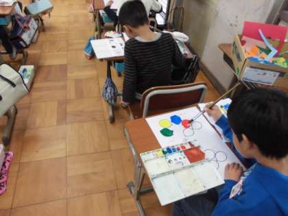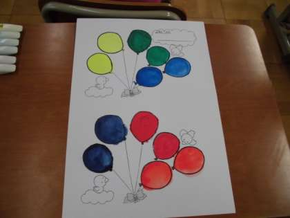 初めて絵の具セットを使って学習をしました。初めに好きな色を使って模様をかきました。つぎに,水の量を考えながら風船を塗りました。なかなかうまく思った濃さにならず困っている様子も見られましたが,色塗りをみんなで楽しみました。