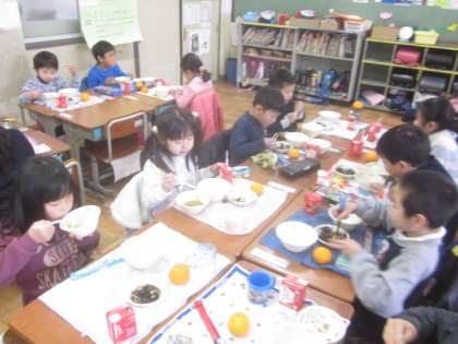 ひじき豆,水菜とつみれのはりはり鍋,とってもおいしかったです!デザートのみかんも喜んでいました!