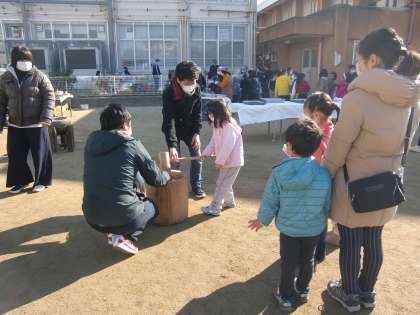 1月13日(日),少年補導委員会の皆様のご協力で「もちつき大会」が実施されました。多くの子どもたちが集まり,杵を振りかざしてのもちつきに挑戦しました。「おもちの真ん中をつくんだよ」と教えてもらってはいましたが,やってみると真ん中になかなか振り下ろせず苦労している場面も見られました。冬の寒い中,暖かい「お雑煮」もいただき,心も体も暖まりました。