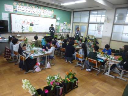 一日参観の中で,1・2年生は,フラワーアレンジメント(花育)の体験をしました。3年生は地域の女性会の方々にお世話になり,お茶会を催して頂きました。1・2・3・4年生は中京署の方に来て頂き,非行防止教室を行いました。5・6年生は情報モラルの学習として,ケータイ教室を行いました。