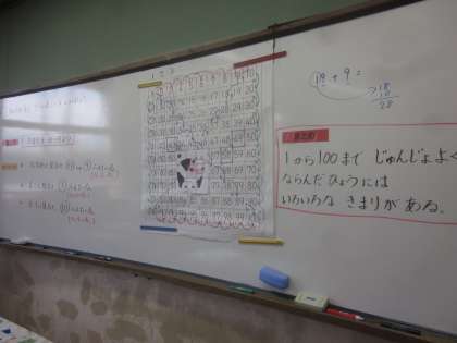 昨日の続きです。順序良く並んだ100までの表,この中に隠されたきまりを探し出しました。横に見ると1ずつ増える・減る,縦に見ると10ずつ増える・減る,斜めに見ると,11もしくは9ずつ増える・減ること,子どもたちみんなで協力し合って見つけ出しました。また,ノートの様子もご覧ください。