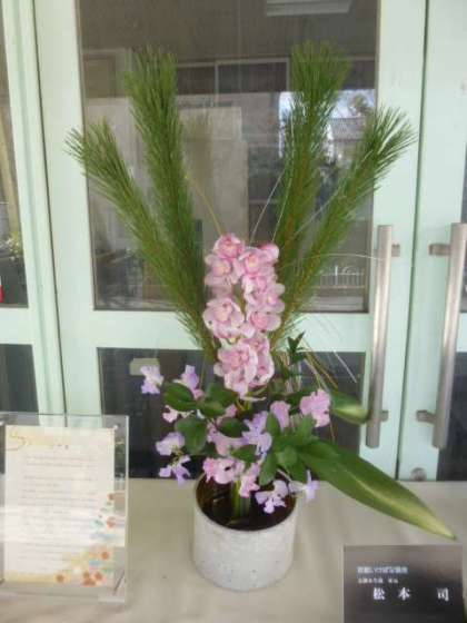 現在,本校の正門を入ってすぐ左手の所に,「生け花」を飾っています。京都府花き振興ネットワークによる「花育活動」として,昨年度に続き京都未生流家元の松本先生に活けていただきました。