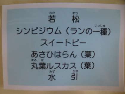 花材(若松・スイートピー)が横に置いてあるので手に取る事ができ,子ども達にも親しみやすいようにしてくださっています。