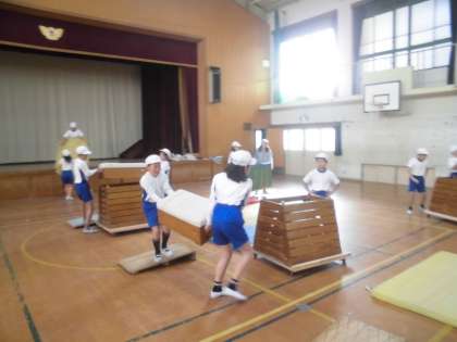 体育の学習でとびばこをしています。ねらい1はできる技のレベルアップです。高さや踏み切り板の距離を変えて挑戦しています。ねらい2では,新しい技を練習しています。台上前転や横かかえこみとびができる子が増えてきました。準備や片づけも協力し,素早くできています。