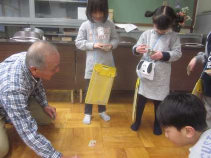 生活科の学習で,昔遊びを地域の社会福祉協議会の皆様から教えていただきました。いろんなお話をいただきながら,いっぱい関わって楽しみました。おじゃみやメンコ,けん玉,だるまおとし,こま,おはじき,あやとり等,子どもたちはとっても喜んで遊んでいました。