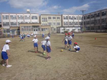 グループの友だちと一緒になって楽しんでいます。ゴールにボールが入っても入らなくっても,みんな楽しそうにしています。