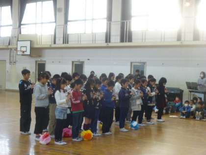 お世話になった6年生に,各学年から心を込めて出し物をしました。また,たてわりグループのみんなからのメッセージカードも渡しました。6年生も中学生に向けての決意表明をしたり,合奏や歌を在校生に披露したりました。最後はみんなで花道をつくり,6年生を送りました。