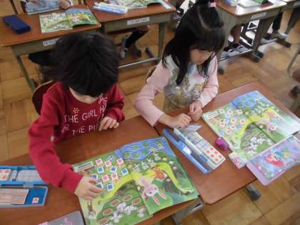 算数では,数の学習をしました。教科書の絵を見て,かえる・鳥・ちょうちょなどの数を数図ブロックを使って数えました。「○○のほうが多い」や「ブロックを使うと数えやすい」,「たしたら・・・」などこれから学習していくことをすでにどんどん見つけていました。