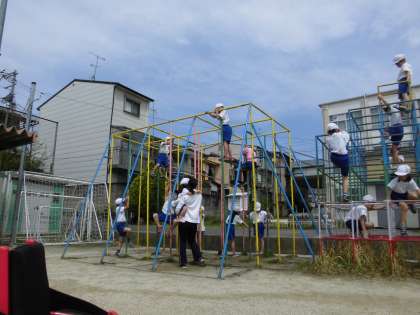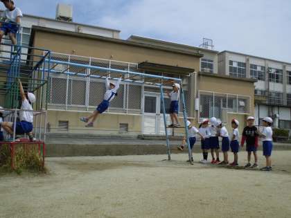 今日も体育の学習で遊具で遊びました。昨日は上れなかった3階に上れた!と喜んでいる様子も見られました。今日はジャングルジムや雲梯,のぼり棒にもチャレンジしました。