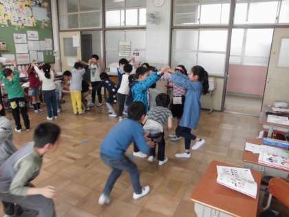 音楽の時間に「ロンドン橋落ちた」の歌に合わせて遊びました。橋につかまらないようにさっと通りぬけたり,つかまえようと大きく橋を落としたり,笑顔いっぱいの歌遊びになりました。