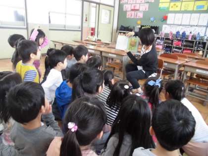 今日の3時間目,教室にPTA読み聞かせサークル「本は友だち」の方々が来てくださいました。4冊の絵本の読み聞かせとペープサート劇で楽しい時間を過ごすことができました。