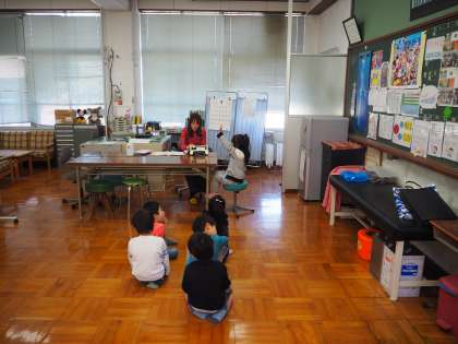 1年生の聴力検査では、「聞こえたら、手をあげてください。」という保健室の先生にこたえて、検査を受けていました。