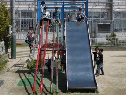 今日の中間休み,青空のもと総合遊具を楽しむ2年生。にこにこ顔です!
