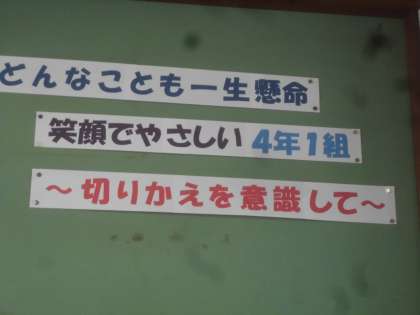 桜の絵ができあがり,教室に掲示しています。一人ひとりの個性豊かな絵が集まると,きれいになるもんだなぁと感心しています。学級目標も決まりました。『どんなことも一生懸命 笑顔でやさしい4年1組 〜切りかえを意識して〜』いろいろなことにチャレンジし楽しい一年間にしてほしいと思います。