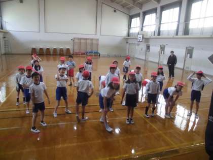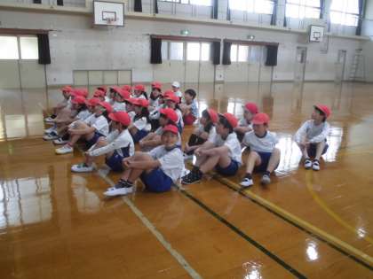 高学年の仲間入りをし,話を聞くときなどしっかりと体育座りができている4年生です。フープを使ってリレーをしたのですが,学級目標の通りチームで声を掛け合いながら,みんな一生懸命走っていました。
