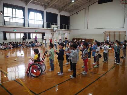 2年生は、「子犬のBINGO」という曲に合わせて、画用紙に一文字ずつ書いたB・I・N・G・Oの動かしながら元気に歌っていました。