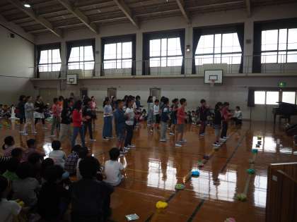 6年は「あいうえおんがく」という曲にあわせて、隊形をかえたり、ダンスを入れていました。振り付けはすべて自分たちで考えたそうです。練習の時間は短かったそうですが、出来栄えは上々。さすが6年です。