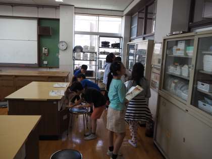 5月10日(木)家庭科の授業です。この日は家庭科室での授業、どんなものが、どこにあるか、おなべ、スプーン、湯呑み、魔法瓶など家庭科室探検でした。