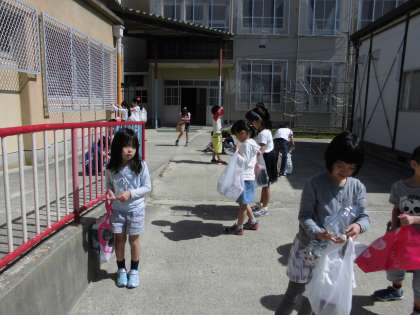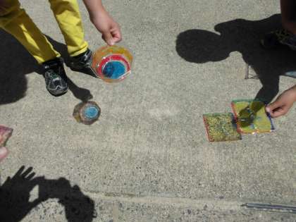 図画工作科の学習では,プラスチックの材料に光をあててどんな風にうつるのかを楽しみました。持ってきた材料にペンやカラーセロハンを使って色付けすると,地面に色あざやかなもようが移り,さらに重ねてみたり,向きを変えたりして楽しみました。