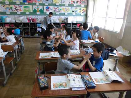 2拍子や3拍子を感じながら手遊びをしました。友達といっしょに拍子をとる手遊びをすると,息をぴったりと合わせて音楽を楽しむペアや,ちょっぴりずれてしまって笑ってしまうペアもいて,にこにこ楽しい音楽の時間になりました。