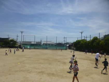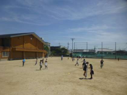 今日は真っ青な五月晴れ。昼休みになると,たくさんの子ども達が運動場で遊んでいます。英語のテビン先生も一緒に遊んでいます。