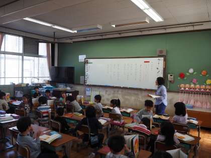 1年の国語は教科書の音読です。体育は、天気がよく、運動場での活動です。今日は清々しい気候でした。