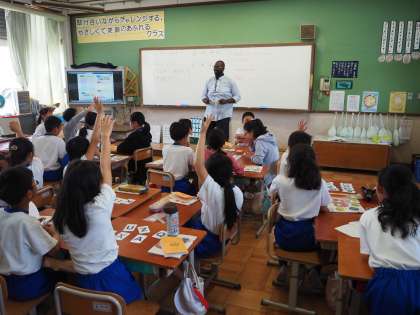 ALTのテビン先生と山田先生の授業のようすです。アルファベットの文字を選び出すことを英語で問いかけて、グループ対抗のゲーム形式行います。5年生は一生懸命でした。