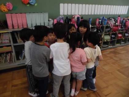 「ひらいた ひらいた」の歌詞に合わせ,体を動かしながら歌いました。初めは「開く」「つぼむ」の動きにばかり興味がいっていましたが,どんな動きがいいか話し合いました。最後は,拍の流れに合った動きや花が開いたりとじたりする様子を表現することができました。