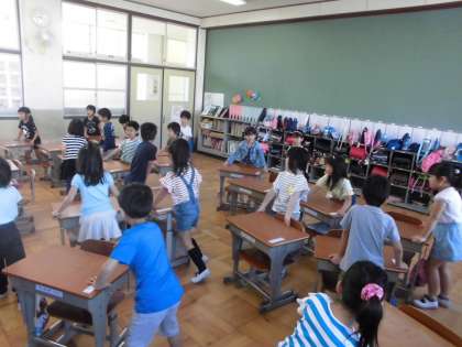 入学してしばらく経ち,やっと友だちの顔と名前が覚えられてきました。そこで,初めての席替えをしました。自分の場所に机と椅子を移動するだけで,1年生にとっては大変なようでした。どんどん新しい友だちと交流し,お互いのことを知ってほしいと思います。