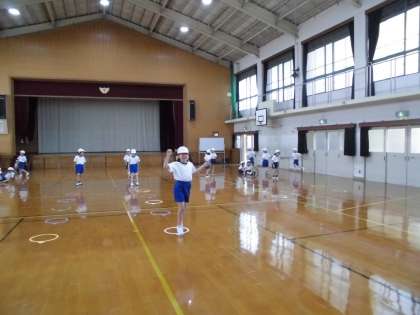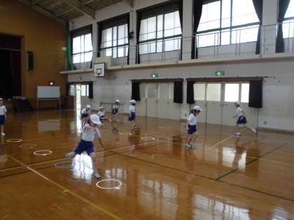 体育の学習でとびくらべを始めました。4歩は片足で跳び,最後の5歩目は両足で着地します。大きく両腕を振って跳んでいました。