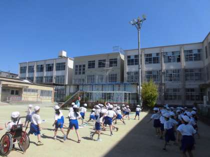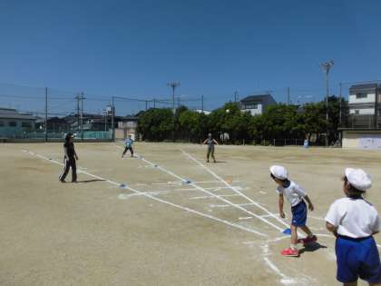 1・2年合同でソフトボール投げをしました。投げるフォームを練習し,試しに投げてみると意外に難しそうでした。本番は力いっぱい投げることができました。中間休みや体育の学習でも投げる運動に親しんでいってほしいと思います。