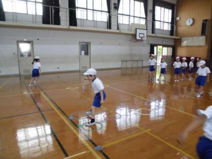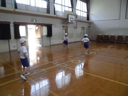体育の学習で,今日もとびくらべをしました。準備運動にだるまさんがころんだをしました。前よりも楽しく取り組めるようになってきたように思います。次に,『けんけんぱ』をしました。上手に全身を使ってリズムよく跳ぶ様子も見られましたが,片足から両足になると,おっとっと…と止まってしまう様子もありました。その後ゴム跳びもしました。高く飛ぶためにはどうしたらよいかを考えて,次の時間に練習していきます。