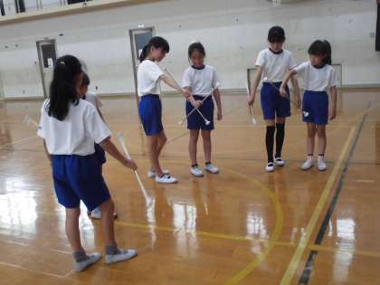 今日からバトン部の練習が本格的に始まりました。4年生もマイバトンを持って5年生・6年生のお姉さんにと一緒に活動です。初めてバトンを回したと思えないぐらいかっこよく回していました。また,5年生・6年生のお姉さんもポイントを押さえて上手に教えていました。これから,運動会や発表会に向けて力を合わせて頑張る姿が楽しみです。