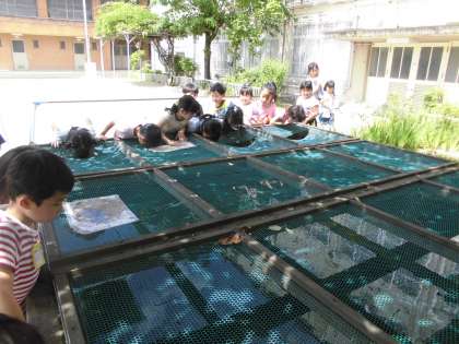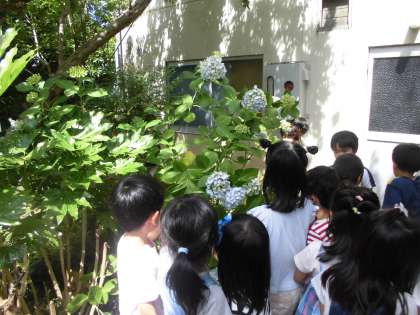 校内のあじさいがきれいに咲いています。3か所のあじさいを見比べ,それぞれの色や形の違いを楽しみました。校庭隅の池の金魚も元気に泳いでいました。全校の畑や花壇の野菜や花もぐんと生長したように感じました。