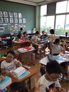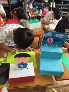 クランクの仕組みを使って,楽しい作品をつくっています。アイデア通りにできているお友達やアイデアの通りに作ろうと挑戦しているお友達・・・。クランクを動かしながら頑張っています。